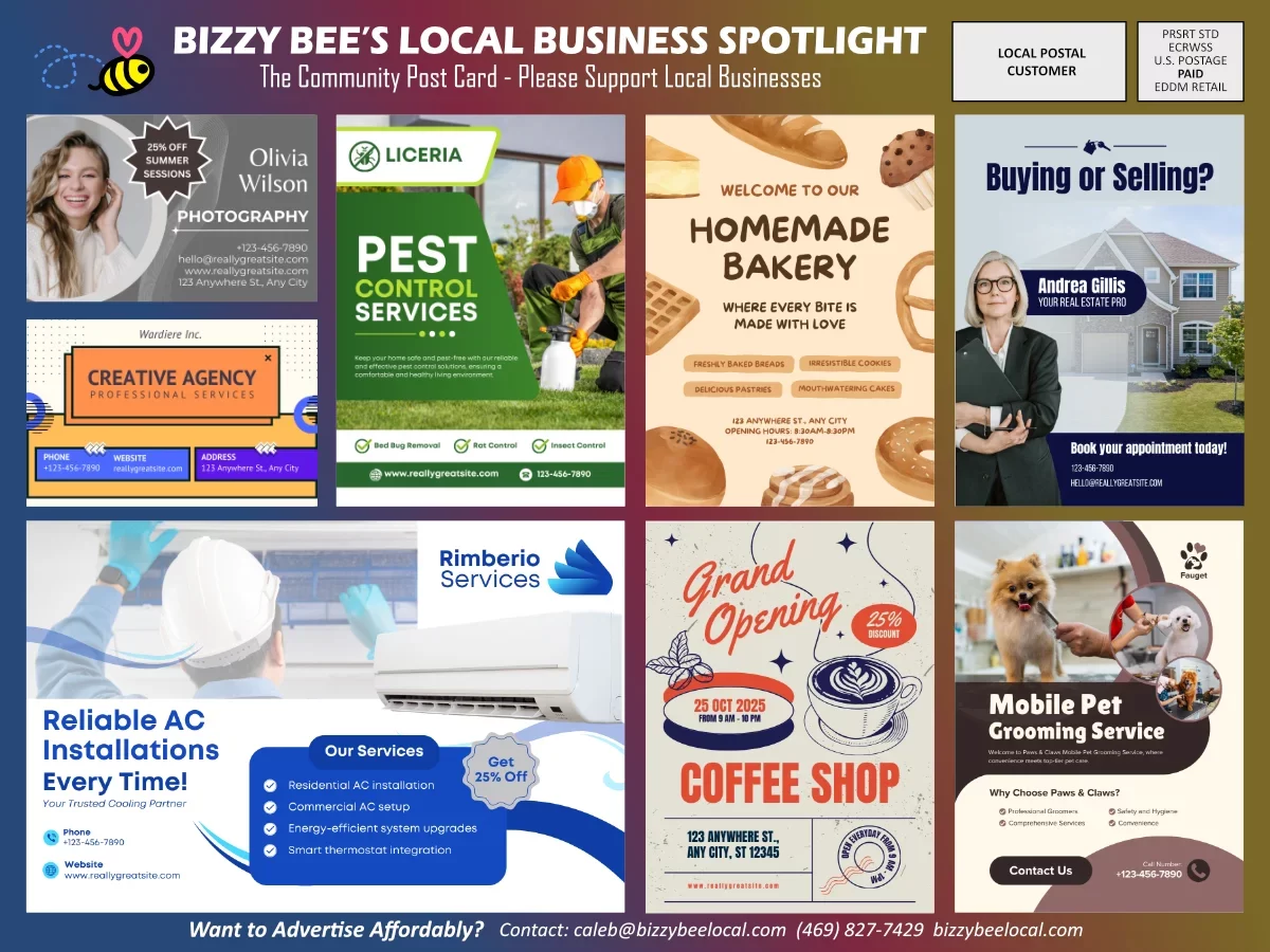 At Bizzy Bee, we believe every small business deserves a spotlight. Our professionally designed postcards are mailed directly to thousands of homes in your community, bringing your business front and center. Whether you’re new to advertising or a seasoned pro, we’re here to make local promotion easy, affordable, and effective.